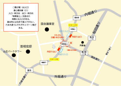 首都高速の霞が関出口です。 都心環状線(C1)の中でも特に使われる出口だと思います。 内回り、外回り両方向とも、出てすぐの交差点(財務省上)は右折不可です。すこし先でUターンできるようになっています。 大企業が集まる大 […]