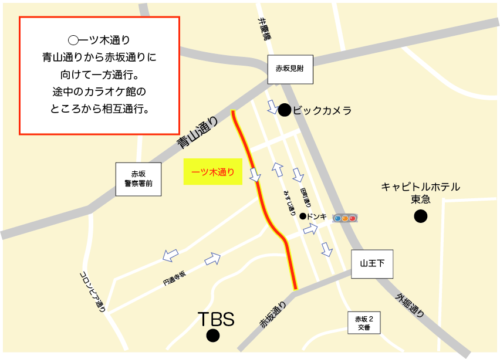 赤坂見附の一ツ木通りです。 「赤坂見附」交差点から青山通り(国道246号)を青山方向へ進み、3本目の路地です。セブンイレブンを越え、左にカラオケ館が出てくるところまで一方通行です。夜間、カラオケ館から外堀通りに向けての […]