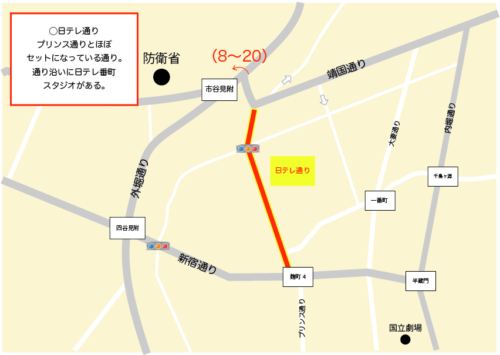 麹町の日テレ通りです。 赤坂見附と麹町をつなぐプリンス通りとほぼセットというか、続いている通りです。赤坂見附の方向からはそのまま市谷見附まで抜けられます。 ただ「市谷見附」交差点から日テレ通りへは進行できないことに注意 […]