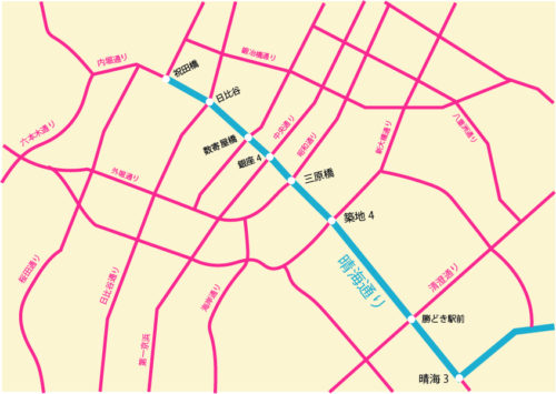晴海通りは、皇居の祝田橋から勝どき方向へ延び、江東区の豊洲のほうへと続いています。 交差点 交差する通り 目印など 祝田橋 内堀通り 日比谷 日比谷通り ザ・ペニンシュラ東京 〇 〇 数寄屋橋 外堀通り 東急プラザ銀座 […]