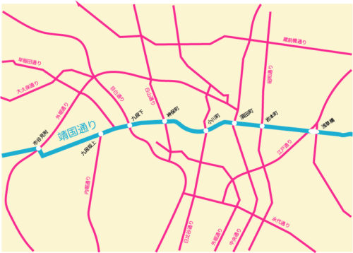 中央通りは、南側は第一京浜からそのまま銀座を通り上野まで延びています。中央区の特に銀座付近は「銀座通り」とも呼ばれるようです。 交差点 交差する通り 目印など 神田駅前 〇 室町4 室町3 江戸通り 室町3南 日本橋三 […]