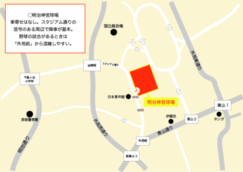 外苑の明治神宮野球場です。 車寄せのような降車専用の設備はありません。青山通り(国道246号)の「外苑前」交差点~外苑西通りの「仙寿院」交差点を結ぶ「スタジアム通り」の信号の両脇あたりで降車するのが基本です。 平日にヤ […]