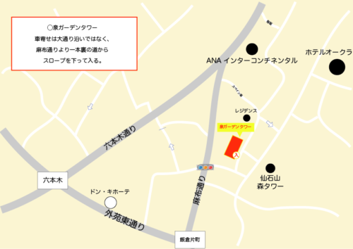 六本木1丁目の、アークヒルズ仙石山森タワーです。 車寄せはイラストの「入」の位置から進入します。すこし構内を回って最初がオフィス、そのあともうすこし回って反対側にレジデンスの車寄せがあります。麻布台ヒルズの裏の道(桜麻 […]