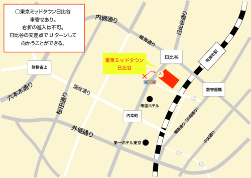 有楽町の東京ミッドタウン日比谷です。 日比谷通りの「日比谷」交差点の近くに車寄せへの進入口があり、左折のみで進入可能です。右折進入は中央分離帯があってできないため、「日比谷」交差点でUターンして向かうことになります(常 […]