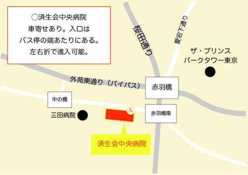 三田の「済生会中央病院」です。 「赤羽橋南」交差点の通り沿いにあります。車寄せへは左右折で進入可能で、上記のように目印は「タイムズの看板」と「バス停」です。駐車場入口とは別なので注意してください。 すぐ近くに「(国際医 […]