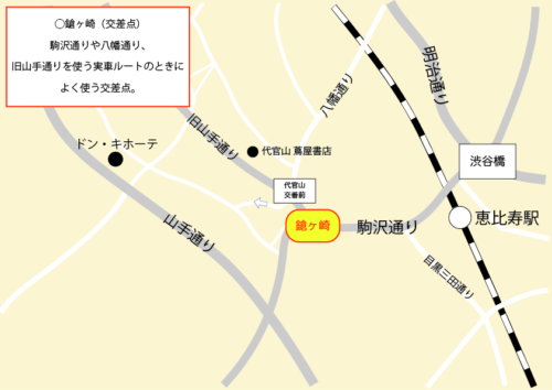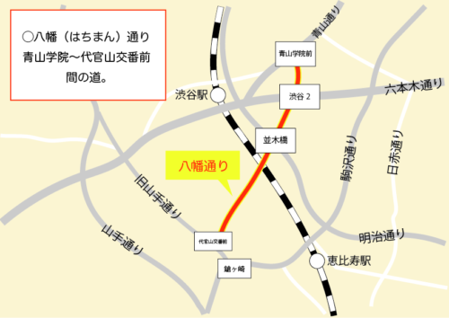 概要 代官山を通る「八幡(はちまん)通り」です。 青山通りとの交差点「青山学院(前)」、明治通りとの交差点「並木橋」、旧山手通りとの交差点である「代官山交番」がキーワードです。またすぐの「鎗ヶ崎」交差点の名前をルート確 […]
