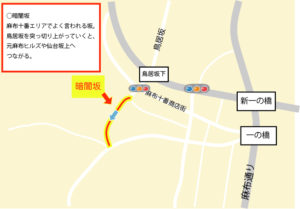 港区の麻布エリア(東麻布を除く)でタクシーを運行するうえで重要なポイントをまとめました。坂が多いエリアですが、まずはイラストにある坂から覚えていくとよいと思います。