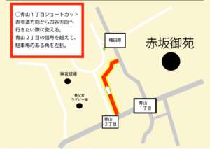 青山通りカナダ大使館の先を曲がる→突き当たりを右折→突き当たりが外苑東通り