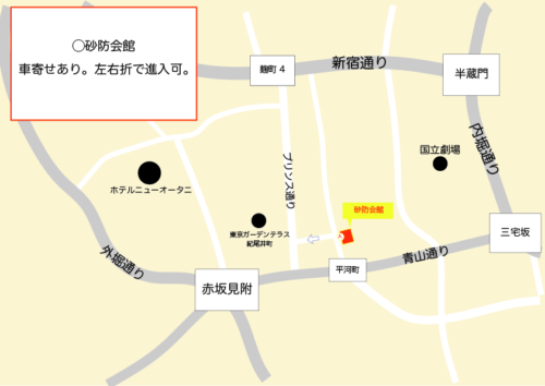 平河町の砂防会館です。 このあたりの目印としても使われる印象があります。プリンス通りの1本東にある通り(「貝坂通り」というそうです)沿いにあります。車寄せへは左右折で進入できます。