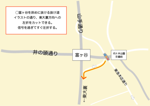この周辺の目印です。「セルリアンタワーの裏を抜けるルート」の曲がるポイントであったり、代官山方向から来て「南平台」交差点へ抜ける際の曲がる交差点になっています。