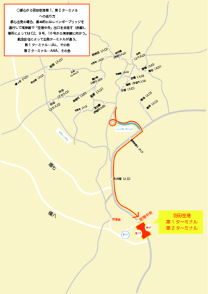 C2中央環状線の、山手トンネルを利用して第3ターミナルへ向かう場合です。当サイトのテーマである都心5区を出発地とした例だと、「初台南」ICや「幡ヶ谷」ICから首都高速を使ったときです。注意したいのは、山手トンネルから直接は1号羽田線に向かうことはできないということです。山手トンネルを通行した場合いったん湾岸線に出て、その後東海JCT~昭和島JCT間の分岐線を使用して1号羽田線に合流することができます(イラストの赤線参照)。湾岸線から第3ターミナルに向かう場合も同様です。