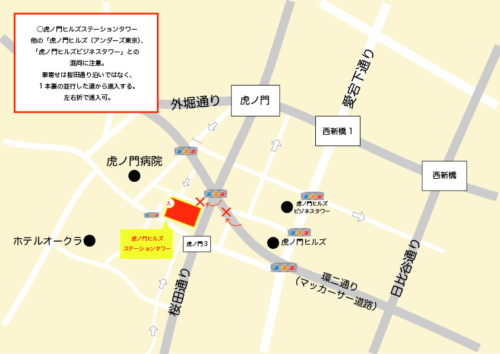 あり…入口から建物のスロープを進行して、地下に車寄せがあります。イラストの「入1」から進入した場合、建物に入って奥がオフィス、手前がホテルの車寄せです。
