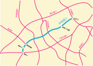 根津美術館から行くと、途中ふたまたからずっと一方通行です。つきあたりは六本木通りの側道なので、左折したらすぐ西麻布の交差点です。もし広尾方向に右折する場合、直進のような形で右折レーンに入ります。