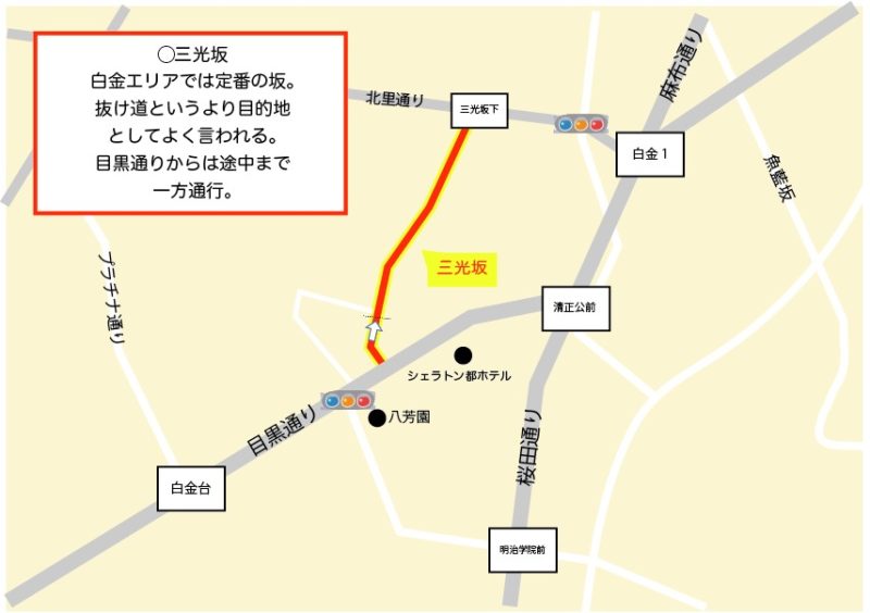 目黒通りからは一方通行で進入し、途中から「三光坂下」までは相互通行です。
