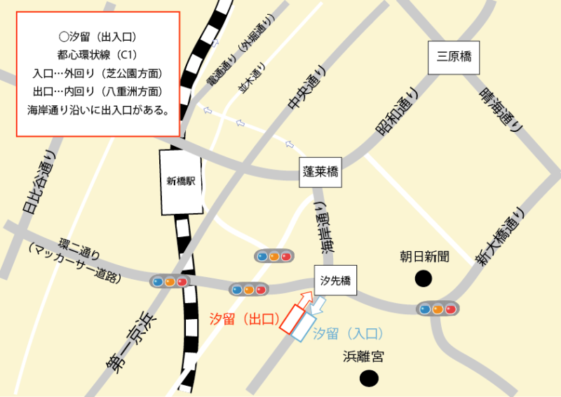 汐留入口へ向かうパターンで、よくある入り方…というのは特に思いつきません。蓬莱橋交差点から海岸通りに入る、環二通りから汐先橋を右折する、築地方向から汐先橋を左折する。何か「これは新人が知らないけどよく使うルートだ!」というのがもしあれば教えていただけると嬉しいです。
